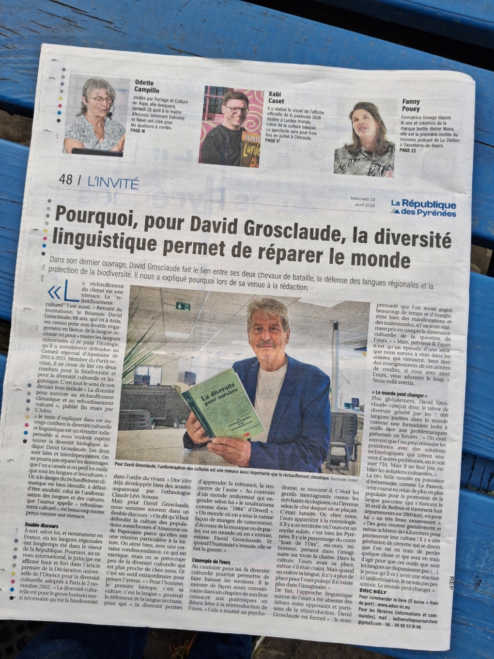 A partir d’experiéncias personaus, deu men tribalh de jornalista, deus mens viatges, de rencontres e tanben de tèxtes d’autors coneguts o pas, qu’essagi de har compréner que se l’escaloriment deu climat ei un perilh deus grans, l’uniformisacion de las lengas e de las culturas, qui apèri « l’en.hrediment culturau », ei ua miaça autan grana com la disparicion de la diversitat biologica.