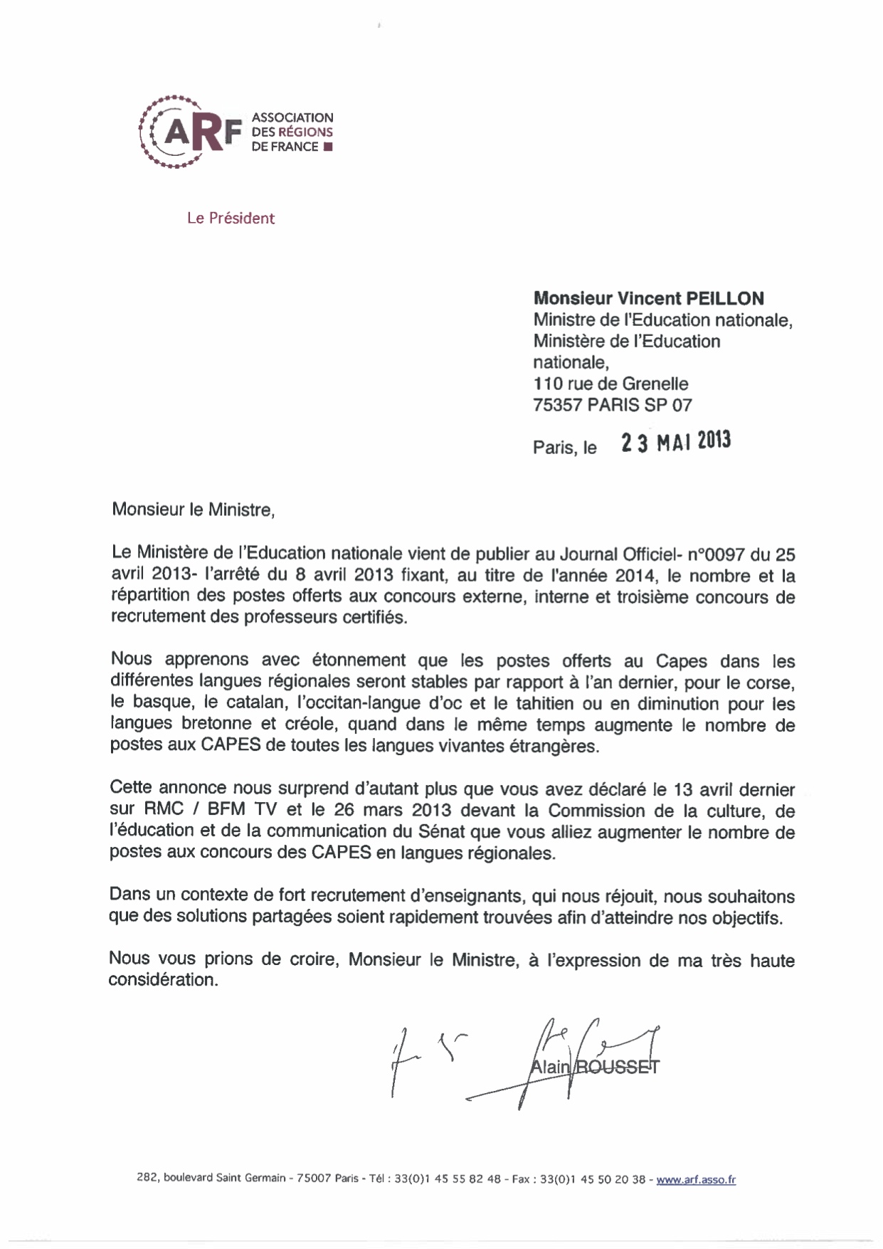Afin de montrer que le président de la République n’a pas renoncé à ses promesses nous espérons qu’il aidera à la mise en place d’une législation complète. Nous attendons du premier ministre qu’il prenne une initiative audacieuse afin de régler la question des langues régionales dans la vie publique et dans les médias qui sont avec l’école les deux piliers d’une politique linguistique publique.