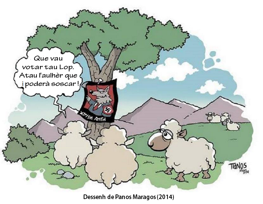 Tout ça pour en arriver à vous dire que mon antidote c’est ce dessin de Panos Maragos, un dessinateur grec qui met en scène des moutons dans un pré. Ils regardent une affiche électorale sur laquelle se trouve un loup plutôt menaçant. Un des moutons dit alors : « je crois que je vais voter pour le loup ; ça fera réfléchir le berger ! ».